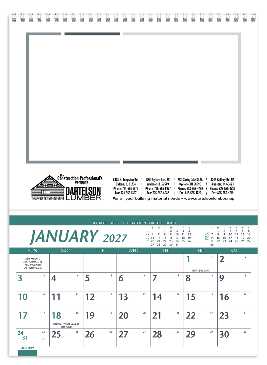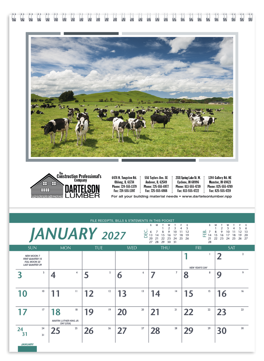 This high-quality pocket calendar comes at a great price, and features information for farmers and ranchers and a convenient storage pocket each month. The FSC® label means that the materials used for this product come from well-managed FSC®-certified forests and other controlled sources.